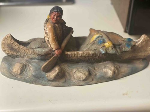 This is a vintage sculpture depicting a Native American figure navigating a canoe, accompanied by an animal figure, possibly a wolf or fox, nestled in the front of the canoe. The item is likely made of a resin or composite material, hand-painted with earthy tones such as various shades of brown for the figure's clothing and the canoe, and a light blue-grey for the water base with some beige highlights for rocks or rapids. The Native American figure is shown with dark hair, a braided ponytail, and what appears to be a red facial feature or paint, and is wearing a light brown tunic or jacket. The figure holds a paddle, indicating movement through water. The animal figure in the front of the canoe is less distinctly rendered but features prominent yellow and blue markings, possibly tribal paint or decorative elements, on its head, which could suggest it's a spirit animal or a specific type of creature known for those colors in art. The base of the sculpture is molded to represent rippling water and rocks, providing a dynamic and natural setting for the scene. The overall craftsmanship suggests a commercially produced decorative item, possibly from the latter half of the 20th century. Given the 'excellent condition' context, the piece appears well-preserved with no obvious chips, cracks, or significant paint loss, and retains its original charm and intended aesthetic. The details, while not exquisitely fine, are sufficient to convey the scene and subjects clearly, indicating a decent level of artisan skill for mass-produced decor.