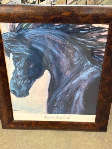 This item is a commercially produced art print or poster featuring an expressive, painterly depiction of a dark horse's profile. The subject is rendered with vigorous, visible brushstrokes in a palette dominated by deep blues, blacks, and purples, highlighted with hints of white and pink to suggest movement and muscle definition. The artist's name, 'Karen Leibrick,' is printed in a stylized script along the bottom white border. The artwork is housed in a substantial, dark wooden frame with a mottled, faux-tortoise shell or burl wood finish. The frame exhibits some minor surface wear and small scuffs, particularly along the right vertical edge, suggesting a vintage or contemporary used condition. The print appears to be protected by glass or acrylic. Karen Leibrick is known for her equestrian-themed works, typically dating from the late 20th century. The piece features a high-contrast composition that emphasizes the equine form's power and grace. The overall presentation is that of a decorative wall hanging suitable for residential or commercial decor.