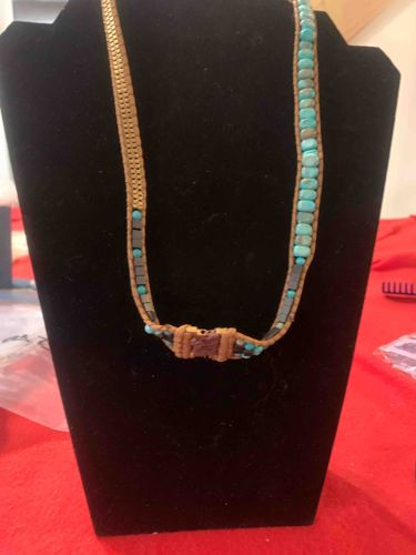 This is a contemporary multi-strand wrap bracelet featuring a bohemian chic aesthetic. The piece is constructed using multiple parallel strands of tan or light brown leather cord, which serve as the frame for various decorative elements. The ornamentation includes rows of small, round turquoise-colored stone beads, interspersed with rows of dark gray or metallic hematite-style square cubes. One distinct section of the bracelet is accented with a metallic gold-toned ball chain, adding a layer of texture and mixed-metal contrast. The stones and metal beads appear to be hand-tied or woven directly between the leather cords with fine coordinating thread. A notable feature is the central ornate toggle or button closure, which appears to be made of a brownish-purple molded material, possibly resin or a treated semi-precious stone, providing a secure and decorative fastening point. Regarding condition, the piece shows light evidence of wear consistent with age, including slight fraying of the cord fibers and minor surface oxidation on the metallic components. There are no missing stones or significant structural breaks visible. The style suggests a 21st-century manufacturing date, characteristic of high-quality artisan-inspired fashion jewelry. The craftsmanship is evidenced by the consistent spacing of the beads and the secure, tension-based leather weaving technique.