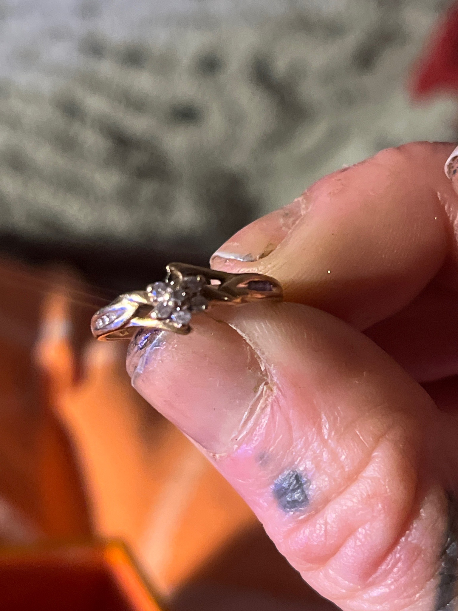 This item is a contemporary style fashion ring, likely crafted from 10k or 14k yellow gold. The ring features a central flower-shaped cluster composed of small round brilliant-cut diamonds. The band incorporates a bypass or 'cross-over' shank design, where the arms of the ring curve around the central setting. One side of the bypass shank is accented with small channel-set melee diamonds, while the other side remains a polished gold finish, creating a sense of movement and asymmetry. The craftsmanship appears to be commercial grade, common in jewelry from the late 20th to early 21st century. The diamonds are tiered in a shared-prong white metal setting to maximize light reflection. Visible condition issues include light surface scratches on the gold shank and some minor dirt accumulation beneath the stone settings. The overall construction is dainty, suggesting it was designed as a promise ring or a delicate everyday accessory. No specific maker's marks are visible in the image, though they would likely be found on the inner circumference of the band.