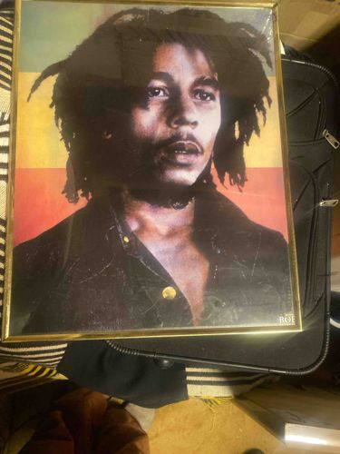This item is a commercially produced portrait poster of legendary reggae musician Bob Marley, presented in a thin, gold-toned metallic or plastic frame. The artwork features a close-up, high-contrast photographic likeness of Marley with his signature dreadlocks, set against a background of horizontal color bands in green, yellow, and red, representing the Pan-African and Rastafarian colors. The print is likely on standard poster paper and is protected by a layer of glass or acrylic. In the lower right corner, there is a small white logo or branding, possibly signifying a specific distributor or collection such as 'BOE.' The frame appears to be of lightweight budget construction, typical of 1990s or early 2000s decorative retail art. Condition-wise, the visible portion of the print shows no significant fading, though there are noticeable glare reflections on the protective surface. The frame shows some minor alignment issues at the corners, indicating light wear. The overall style is contemporary mass-market music memorabilia, commonly found in dorm rooms or head shops, and serves as a popular cultural iconographic piece.
