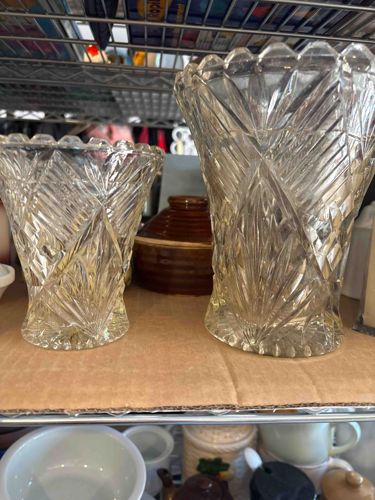 This is a pair of mismatched clear pressed glass vases featuring a classic radial fan and cross-hatched diamond pattern. The taller vessel stands approximately 7-8 inches high, with a smaller companion vessel. Both items feature a scalloped or 'sawtooth' rim and a flaring 'waist' that terminates into a circular, weighted base. The glass displays a yellowish tint, often characteristic of older soda-lime glass or exposure to UV light over time. The construction is molded rather than hand-cut, evidenced by the slight softening of the geometric edges and likely vertical mold seams. The pattern consists of intersecting diagonal lines creating a diamond quilt design at the base, transitioning into long vertical rays or 'fans' that create a crown-like effect at the top. Condition-wise, the glass remains transparent but shows significant surface dust and grime, particularly in the deep crevices of the pattern. There is no visible major chipping on the rims, though flea bites are common in such items. These pieces likely date from the mid-20th century, imitating the more expensive American Brilliant Period cut glass of the late 19th century.