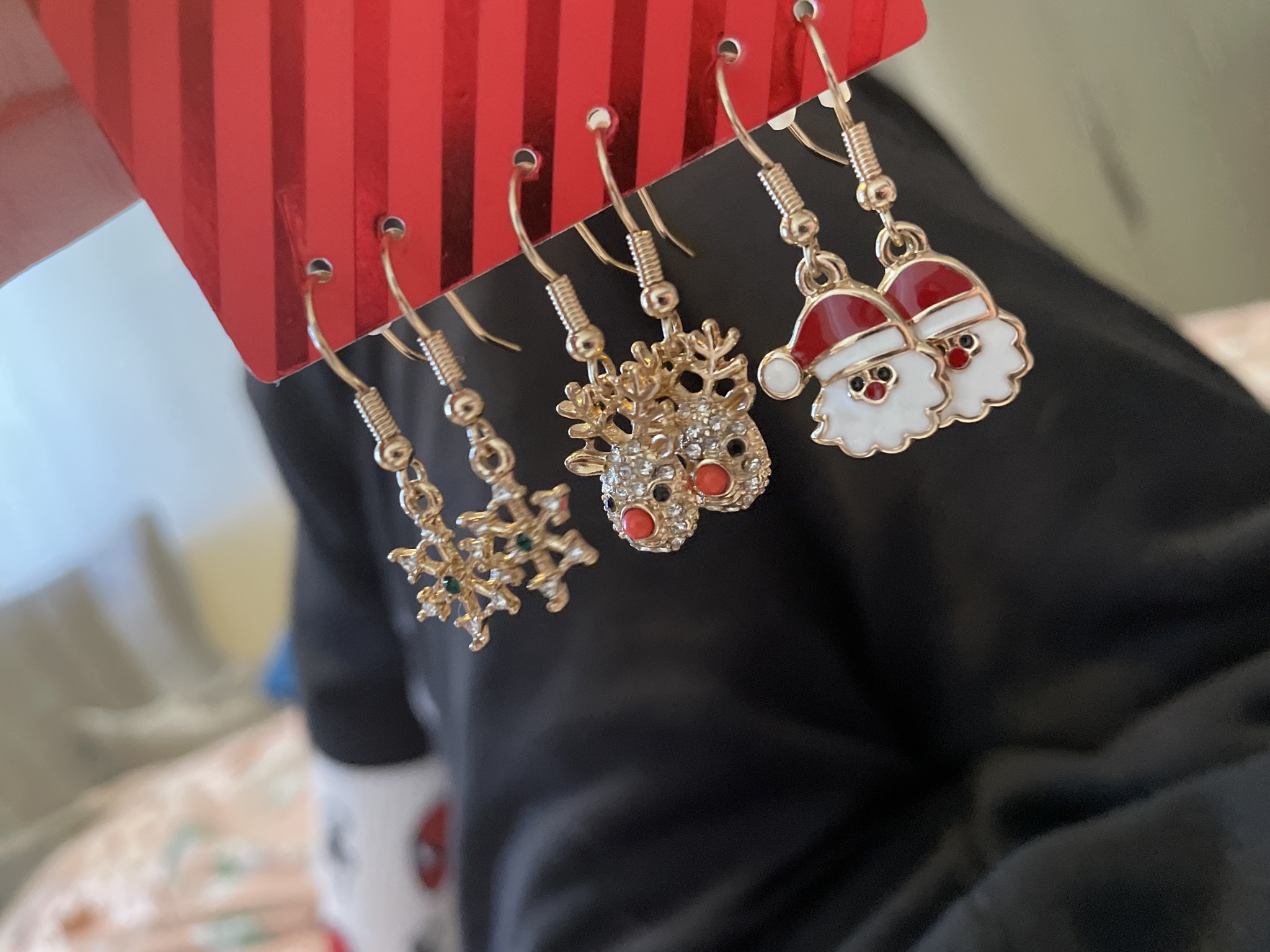 This is a set of three pairs of novelty Christmas-themed drop earrings, displayed on a red and burgundy striped retail card. The jewelry is constructed from a gold-tone base metal, likely a zinc alloy, with various decorative embellishments. The first pair features a stylized snowflake design pavé-set with small clear rhinestones and accented with tiny colored stones (green and red). The second pair depicts reindeer heads, featuring textured gold-tone antlers and pavé-set clear rhinestones on the face, finished with a bright red enamel or bead nose. The third pair consists of Santa Claus faces rendered in white and red enamel with small black and red dot details for the eyes and nose. All three pairs utilize a French hook or 'fish hook' style wire finding, characterized by a curved wire with a decorative coil and bead at the base. The hardware appears relatively uniform and consistent with mass-produced contemporary fashion jewelry. The items appear to be in new or like-new condition with high-shine metallic finishes and intact enamel and stones. There are no visible maker's marks, suggesting these are generic retail items from the late 20th or early 21st century. The craftsmanship is typical for budget-friendly costume jewelry, focusing on festive aesthetic appeal rather than fine materials.