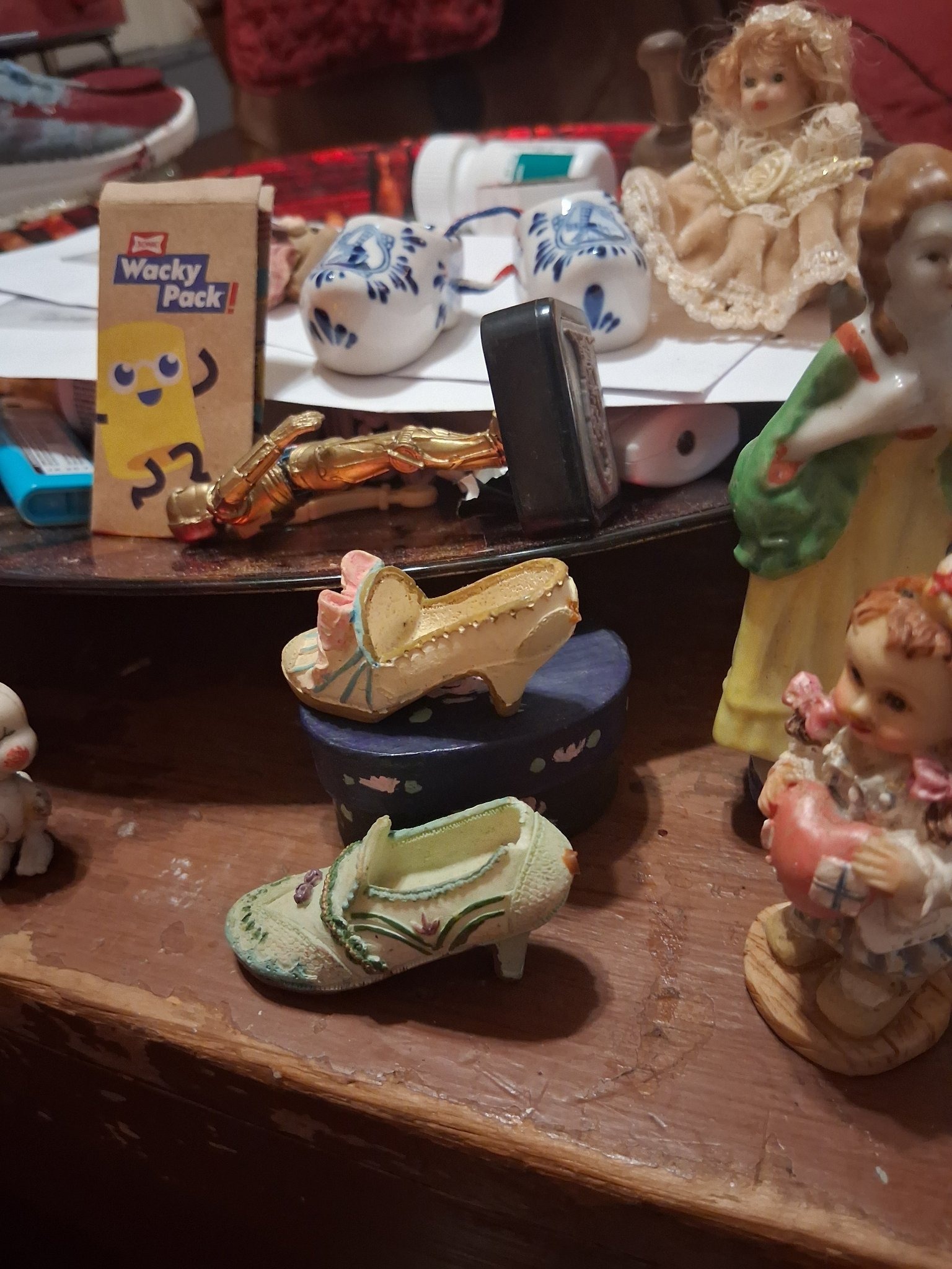 A charming pair of decorative miniature shoes, likely crafted from cold-cast resin or a similar composite material. These items are designed in a Victorian-era heel style, featuring intricate molded details such as simulated lace-up patterns, ribbon bows, and scalloped edges. One shoe exhibits an antique white base with soft pink and teal accents, while the other features a pale green palette with dark green and floral detailing. Each shoe measures approximately 2 to 3 inches in length. They are typical of vintage collectibles from the late 20th century, often sold as decorative trinkets or dollhouse accessories. The condition appears fair to good; there is visible surface grime, dust accumulation in the crevices, and minor paint loss consistent with age and handling. No distinct maker's marks are visible on the exterior, suggesting mass-produced decorative boutique items. They possess a whimsical, nostalgic appeal but show signs of shelf wear and lack premium porcelain craftsmanship.