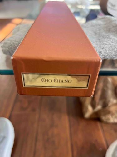 This item is an officially licensed Harry Potter replica wand, specifically representing the character Cho Chang. The wand is housed in its original presentation box, which features a distinctive reddish-brown or sienna-colored exterior with a textured, parchment-like finish. A rectangular gold-toned label with a black border is affixed to the end of the box, clearly printed with the name 'CHO CHANG' in a stylized serif font. The box appears to be constructed from heavy-duty cardboard. Regarding condition, the box shows visible signs of shelf wear, including small indentations or 'dings' along the upper edge of the front panel and some whitening/scuffing at the corners where the paper covering has rubbed away. The label itself shows minor discoloration, possibly due to aging of the adhesive or moisture. While the wand itself is not visible in this angle, the packaging is consistent with The Noble Collection’s high-quality character wand series, which typically utilizes hand-painted resin. These items are highly sought after by collectors of film memorabilia and Harry Potter enthusiasts, produced primarily between the 2000s and present day.
