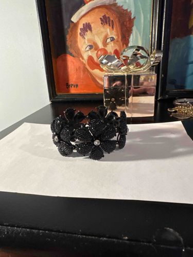 This is a wide, statement-style cuff bracelet featuring a repeating floral motif. The piece is constructed with multiple flower-shaped segments, each adorned with a pavé-style setting of small, round black faceted rhinestones or crystals. Each individual flower centers a larger, contrasting clear or white crystal, which serves as a focal point against the dark base. The metal framework appears to be finished in a black or dark gunmetal plating to blend seamlessly with the stones. The bracelet has a substantial, chunky profile and appears to be of the 'stretch' or hinged variety, common in mid-to-high-end costume jewelry. Regarding condition, the piece appears to be in good vintage or contemporary condition with all visible stones intact, though microscopic inspection would be needed to check for loose settings or surface scratches on the facets. There are no obvious signs of metal oxidation or plating loss. This style is characteristic of late 20th-century to early 21st-century costume jewelry, emphasizing bold, glamorous aesthetics typical of brands such as Kenneth Jay Lane or high-end boutique labels. The craftsmanship shows careful attention to detail in the alignment of the pavé stones and the multi-dimensional layering of the floral petals.