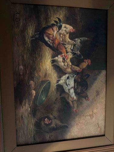 This rectangular oil painting, oriented vertically, depicts a lively barnyard scene featuring a central rooster surrounded by several hens and chicks. The composition utilizes a chiaroscuro technique, with dramatic lighting highlighting the textural qualities of the straw and the birds' plumage against a dark, shadowy background. The palette consists of earthy tones, including deep ochres, sienna, and blacks, punctuated by the vibrant reds of the birds' combs and the iridescent greens and blues in the rooster's tail feathers. A simple green ceramic bowl rests in the hay in the lower-left foreground. The artist's signature, 'A. Laux,' is clearly visible in the top left corner, likely referring to August Laux (1847-1921), a German-American painter known for such pastoral and still-life subjects. The brushwork shows significant detail in the individual feathers and the scattered straw, indicating high-quality craftsmanship typical of late 19th-century academic realism. The painting appears to be in its original frame, a simple wide-profile gold-toned moulding. Visible condition issues include some surface dust and potential minor craquelure consistent with age, though no major paint loss or significant repairs are immediately evident. The style and signature suggest a period of 1880-1910.