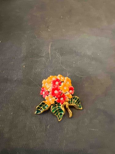This is a mid-century vintage brooch featuring a stylized floral cluster design, likely representing a hydrangea or a similar dome-shaped flower cluster. The piece is constructed from a gold-toned base metal, possibly brass or gold-plated alloy. The central bouquet consists of multiple five-petaled blossoms finished in cold-painted enamel in shades of vibrant melon orange and coral red. Each individual small blossom is centered with a single, clear round-cut pavé-set rhinestone, adding a subtle sparkle. The base of the bouquet is supported by three textured green enameled leaves with gold-toned veining detail. The enamel on the leaves appears to be a darker, forest-green shade with a glossy finish. Overall, the piece measures approximately 1.5 to 2 inches in diameter. The craftsmanship is typical of costume jewelry from the 1960s or 1970s, characterized by the cast-metal back and applied enamel. Condition-wise, the brooch appears well-preserved with no major chips visible in the enamel from the front, though minor surface wear and some oxidation to the gold-toned metal on the reverse (not visible here) would be consistent with its age. The stones appear intact and clear without significant yellowing. While no visible maker's mark is present in this view, the style is reminiscent of manufacturers like Trifari or Boucher, though it is more likely an unsigned quality costume piece.