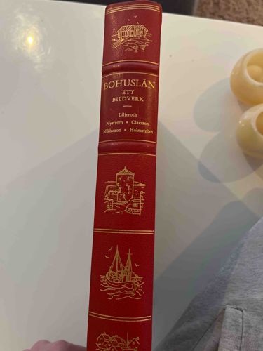 This is a vintage hardcover book titled 'Bohuslän: Ett Bildverk', a Swedish pictorial work chronicling the history and landscapes of the Bohuslän province. The book features a vibrant red textured binding, likely leather or a high-quality imitation, with elegant gold gilt stamping on the spine. The spine is divided by raised bands or horizontal gilt lines into decorative sections containing fine-line illustrations of coastal scenes: a fisherman's cottage, a historic tower, a sailing vessel, and a village cluster. The text on the spine lists the primary contributors including Liljeroth, Nyström, Claesson, Niklasson, and Holmström, suggesting a multi-author scholarly or artistic collaboration. Published in the mid-20th century (circa 1956-1963), the book demonstrates superior craftsmanship with crisp, clear gilt application and tight binding. Physically, the item appears in excellent condition with minimal shelf wear; the corners and hinges seem intact, and there is no evident fading to the red pigment. This specific title is known for being part of the 'Allhems landskapsböcker' series, reflecting high production standards of Swedish bookbinding from that era. Notable for its aesthetic appeal as well as its historical content, it serves as both a collector's piece and a reference for Nordic regional history.
