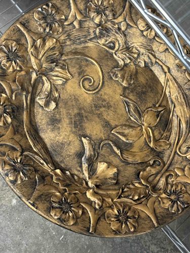 This circular tray features an intricate, high-relief floral motif heavily influenced by Art Nouveau aesthetics, characterized by flowing organic lines and stylized botanicals. The centerpiece is a circular vessel or tray top approximately 12 to 15 inches in diameter. Its surface is adorned with various flora, likely Irises and Primroses, which are sculpted with fluid, whiplash curves typical of late 19th-century design. The material appears to be a cold-cast resin or composition material that has been finished with a metallic gold or bronze gilt. This finish includes a dark antiquing patina applied into the recessed areas to enhance the depth of the sculptural elements. The construction suggests it is a mid-to-late 20th-century decorative reproduction rather than a period antique, likely mass-produced for home decor markets. Condition-wise, the item shows some surface abrasions and minor loss of the gilt finish on high points, revealing a darker underlay. There is visible dust and grime in the deeper crevices, which is common for relief-style pieces. No maker's marks or signatures are visible in the current view, but its uniform casting indicates a molded manufacturing process. The quality is consistent with decorative accent furniture, designed to mimic the appearance of heavier hand-chased bronze or carved wood at a fraction of the weight.