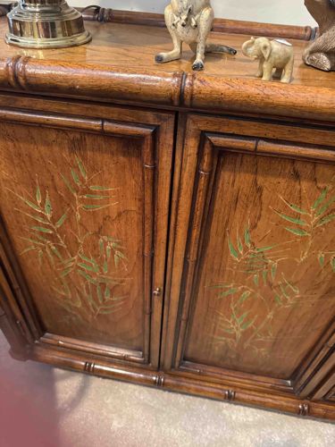 This is a vintage wood storage cabinet or credenza featuring Chinoiserie and Hollywood Regency design elements. The piece is constructed with carved faux bamboo detailing around the frame, door stiles, and top edges, replicating the rhythmic nodes of organic bamboo in a medium-toned brown finish on hardwood or heavy veneer. Each of the two visible cabinet doors features a recessed panel decorated with hand-painted or stenciled green bamboo leaf motifs. The wood grain exhibits a prominent linear character, typical of oak or pecan, common in 20th-century American furniture manufacturing brands like Thomasville or Dixie. The top surface shows a polished finish with minor surface abrasions consistent with use. The doors are secured with small, round metal knobs. Condition-wise, the piece appears structurally sound with some visible wear and scuffing along the lower plinth and trim edges. The paint on the bamboo motifs shows slight fading or intentional distressing, contributing to its vintage aesthetic. Based on the style and construction, this piece likely dates to the late 1960s or 1970s. The overall craftsmanship is high, utilizing solid wood frames around the decorative panels.