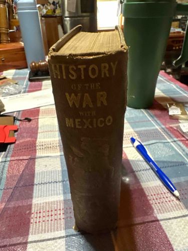 This is a significant historical volume titled 'History of the War with Mexico,' likely an edition published in the mid-19th century (circa 1840s-1850s). The book is bound in a brown, textured cloth over boards, a common binding style for educational and historical texts of that era. The spine features gilded (gold-stamped) lettering that is somewhat faded but still clearly legible. Below the title text, there is a visible embossed or blind-stamped decorative figure, possibly representing a military motif or an eagle, which was a standard design element for patriotic histories of the time. The text block is thick, indicating a comprehensive work, and the top edges of the pages show heavy tanning and dust accumulation consistent with age. Structurally, the book shows significant wear: there is fraying and loss of fabric at the head and foot of the spine, softening and bumping of the corners, and the hinges appear fragile. The cloth shows some discoloration and rubbing across the surface. The paper edges are yellowed, suggesting a high acidic content typical of 19th-century mass-produced paper. Despite the external wear, the presence of original gold lettering is a positive indicator of original craftsmanship.