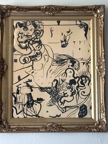 This item is an original work of art or a high-quality print featuring an monochromatic surrealist composition executed in black ink or paint on a cream-toned paper substrate. The artwork displays fluid, expressive line work reminiscent of the automatic drawing techniques popularized by 20th-century Surrealist masters such as Salvador Dal. It features multiple overlapping figures, distorted faces, and biomorphic shapes arranged in a dreamlike, non-linear perspective. The primary subject matter includes a large, ethereal profile on the left and various smaller, stylized humanoids and abstract structures scattered through the mid and foreground. The paper shows a slight warm patina, suggesting some age, and appears to be in overall good condition with no visible tears or heavy staining from this view. The artwork is housed in a substantial, ornate gold-finished (gilt) frame. The frame features traditional Rococo-style flourishes, including scrolled acanthus leaf patterns at the corners and midpoints, adding a classical contrast to the modern, avant-garde style of the artwork itself. The frame shows some minor surface wear consistent with age, but maintains a lustrous finish. There are no clearly visible artist signatures or edition numbers in this perspective, though they may be located under the frame lip or on the reverse.