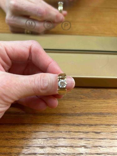 This item is a contemporary style solitaire ring featuring a centrally mounted round brilliant cut colorless stone, likely a diamond. The stone is secured by a traditional six-prong setting, which appears to be white gold or platinum to enhance the stone's color, integrated into a wide, substantial yellow gold band. The band exhibits a polished finish and a slightly domed, wide profile, suggesting it could be a comfort-fit style. The metal shows minor surface abrasions and light scratches consistent with regular wear, but there is no evidence of structural thinning or major deformation. The stone displays high clarity and significant fire under ambient lighting, although a professional loupe inspection would be required to verify natural versus synthetic origin and definitive grade. The craftsmanship indicates a high-tier commercial production from the late 20th to early 21st century. No visible hallmark is shown, but the yellow luster is typical of 14k or 18k gold. The overall condition is good, with all prongs appearing intact and the stone firmly seated.