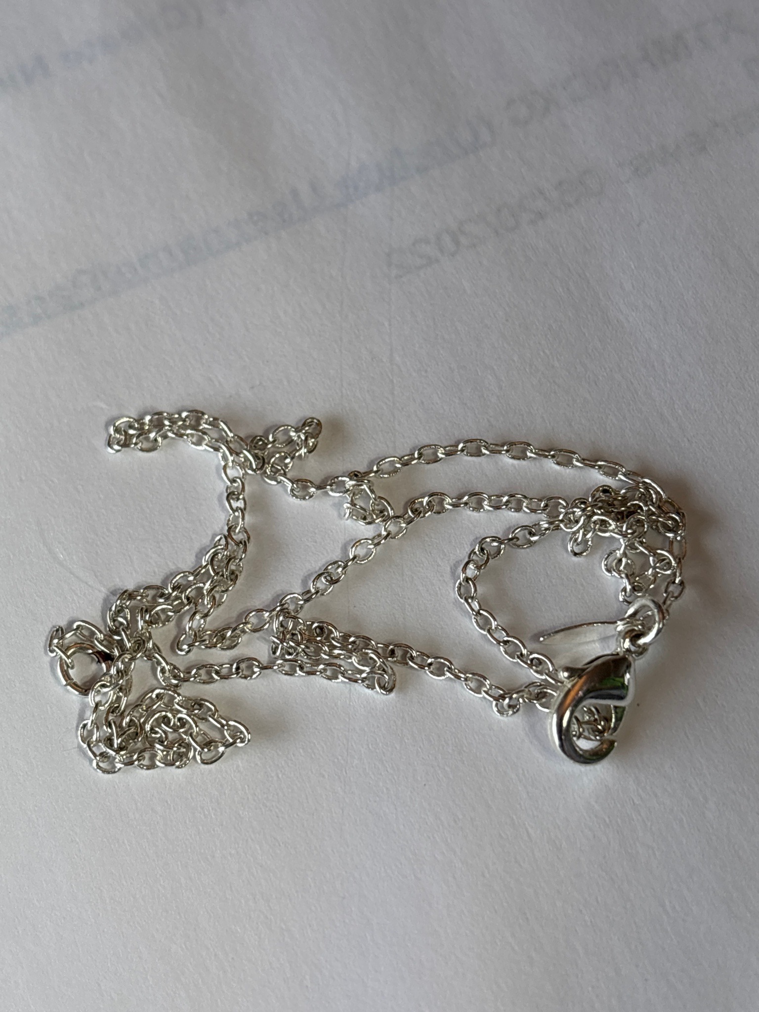 This item is a delicate silver-toned necklace chain featuring a classic cable link construction. The individual links are oval-shaped and uniform in size, characteristic of machine-made jewelry components intended for lightweight pendants. The material appears to be a polished white metal, likely sterling silver or a silver-plated base metal, exhibiting a high-luster finish. The chain is secured with a modern lobster claw clasp, which is attached to the chain via jump rings and includes a flat, teardrop-shaped metal tag (though no hallmark is clearly legible from this angle). In terms of condition, the item is in good contemporary condition with no visible kinks, broken links, or significant tarnish, though fine surface micro-scratches are typical for pre-owned jewelry. The craftsmanship is standard for modern mass-produced jewelry. Based on its style and hardware, this piece is likely of late 20th to early 21st-century origin. It serves as a functional, minimalist piece of jewelry or a replacement chain for a charm or small pendant.