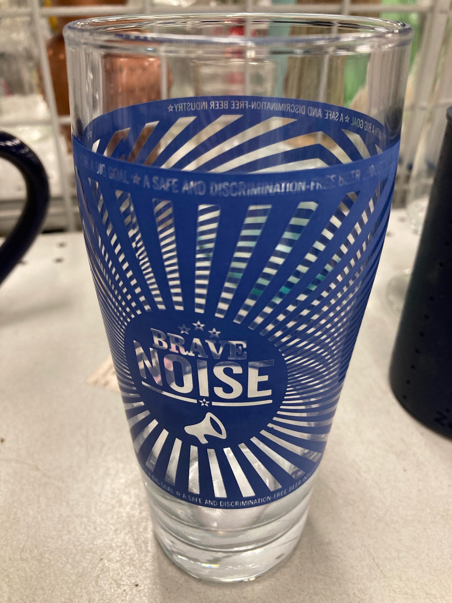 This is a standard 16-ounce Shaker-style pint glass featuring blue and silver screened graphics for the 'Brave Noise' global beer collaboration. The glass is clear with a weighted flat base and slightly tapered walls. The central graphic is a blue circular burst pattern with the words 'BRAVE NOISE' prominently displayed in silver lettering, accompanied by three small stars and a megaphone icon. A repeated circular border at the top and bottom of the graphic field contains the mission statement: 'A SAFE AND DISCRIMINATION-FREE BEER INDUSTRY.' The glass appears to be in excellent used condition with no visible chips, cracks, or clouding. The blue and silver screen printing shows high color density and crisp edges, suggesting a contemporary manufacture (likely post-2021 when the Brave Noise initiative launched). This item represents a specific movement in craft beer culture aimed at supporting women, BIPOC, and LGBTQ+ professionals in the industry. It is a mass-produced but niche collectible item with clean construction and durable screen-printed aesthetics common for modern brewery taproom glassware.