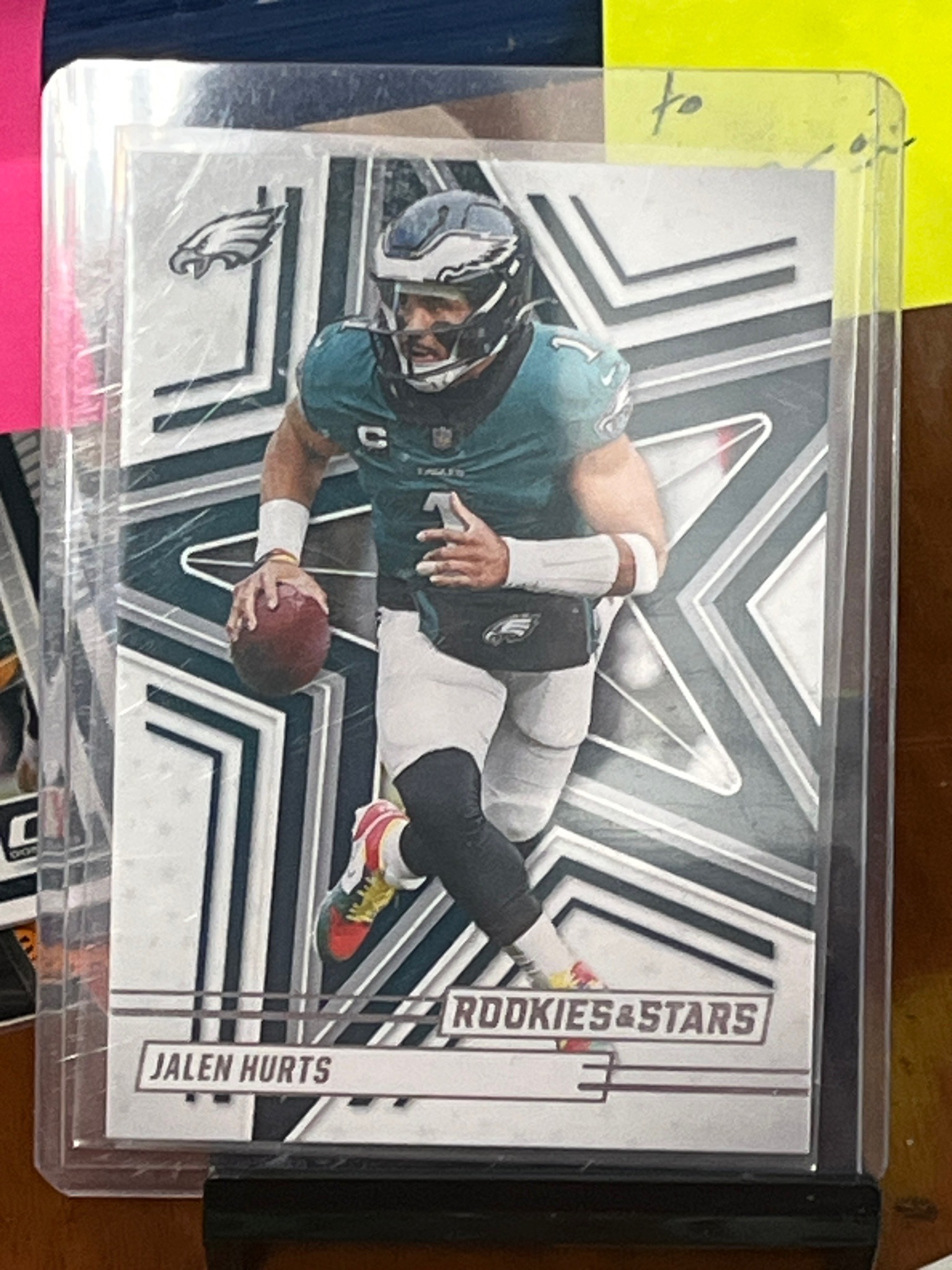 This is a modern sports trading card featuring Jalen Hurts, quarterback for the Philadelphia Eagles. The card is from the Panini 'Rookies & Stars' set. It depicts Hurts in action, mid-stride while carrying a football, dressed in his midnight green Eagles home jersey, white pants, and a black helmet with the silver eagle wing logo. The background design utilizes a high-contrast geometric star motif with gray and white concentric lines, typical of the Rookies & Stars aesthetic. The Philadelphia Eagles logo is positioned in the upper left corner, while the bottom of the card contains the 'ROOKIES & STARS' brand logo and a white nameplate identifying the player as 'JALEN HURTS'. The card appears to be standard 2.5 by 3.5 inches in size, constructed from high-quality cardstock with a glossy or slight metallic finish. Regarding condition, the card is housed inside a soft plastic penny sleeve and further protected by a rigid plastic top-loader. While the outer casing shows light surface scratches and glare, the card itself appears to have sharp corners and clean edges, though an official grade would require inspection out of the case. This card represents a player from the 2020-2023 era, reflecting the modern hobby market's focus on star quarterbacks.