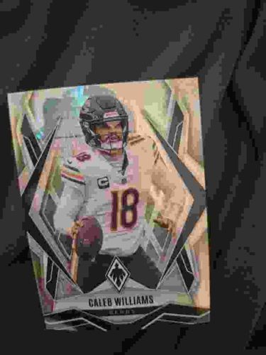This item is a modern sports trading card featuring Caleb Williams, the Chicago Bears quarterback. The card is part of the Panini Phoenix series, characterized by its high-gloss, opti-chrome finish and intricate geometric design elements. The card depicts Williams in his white Bears jersey (number 18) with a black helmet, actively posing in a passing stance. The background features the signature 'Phoenix' aesthetic with prismatic, refracting light effects that change appearance based on the viewing angle. The card displays sharp corners and straight edges, suggesting it is in 'new' or near-mint to mint condition as indicated by the user. The Chicago Bears team branding and the Phoenix firebird logo are clearly visible at the bottom center, above the player's name. The overall construction uses heavy cardstock with a premium multi-layered printing process. As a 2024 release, this represents one of Williams' early professional cards, making it a key item for modern football card collectors and prospectors. No visible surface scratches, edge chipping, or corner blunting can be observed in the current image.