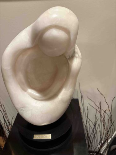 This is an original mid-to-late 20th-century abstract sculpture carved from a single block of translucent white stone, likely alabaster or a high-grade white marble. The piece features a minimalist, biomorphic aesthetic reminiscent of Henry Moore or Barbara Hepworth, depicting a seated or huddled figure with a hollow center, possibly representing a mother and child or a solitary meditative pose. The stone possesses a subtle pinkish-white hue with soft, cloudy inclusions and a polished satin finish that allows light to penetrate the surface. It is mounted on a circular black laminate or wooden tiered base. The base features a small rectangular gold-toned nameplate that appears to read 'JANE CABEEN' or a similar surname, identifying the artist. The construction shows expert subtractive carving techniques with smooth, continuous curves and no visible evidence of mechanical joining. Condition appears excellent with no visible fractures, chips, or pervasive staining, though some light surface dust is present in the crevices. The style suggests a late Modernist approach, emphasizing form and material over realistic detail. The craftsmanship is high-quality, characterized by symmetrical balance and a tactile, fluid surface that enhances the natural beauty of the mineral grain.