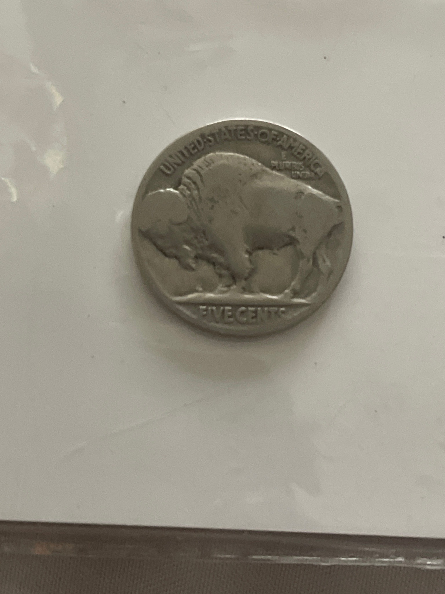 This item is a 1-ounce .999 fine silver bullion round, designed to mimic the reverse side of the historic James Earle Fraser Indian Head/Buffalo nickel (1913-1938). The primary feature is a majestic American Bison standing on a grassy mound, with the text 'UNITED STATES OF AMERICA' and 'E PLURIBUS UNUM' arching above. The denomination 'FIVE CENTS' is visible at the base, which is an aesthetic choice for these reproductions, as silver rounds carry no legal tender face value. While the original nickel was a copper-nickel alloy, this modern piece is minted in highly reflective .999 pure silver. The condition appears to be in 'Circulated' or 'Abused' bullion grade; there are significant surface scuffs, dulling of the luster, and numerous contact marks across the bison's hump and the field area. It lacks the sharp, frosted 'Cameo' finish seen on new strikes, suggesting it has been handled or stored without a protective capsule. Despite the numismatic wear, the item retains its intrinsic 'melt value' based on its documented silver weight. These rounds are popular among stackers and investors for their combination of classic American numismatic art and precious metal content. No specific private mint mark is immediately discernible on this face, which is common for generic rounds of this type produced by various US refineries in the late 20th and early 21st centuries.