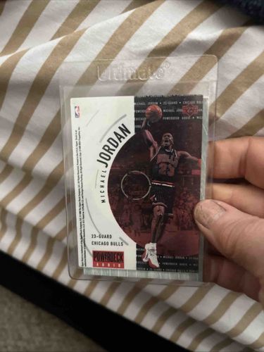 This is a 1999 Upper Deck PowerDeck Audio Michael Jordan collectible card, featuring an innovative digital-physical hybrid design from the late 1990s. The card is constructed from a rectangular piece of clear plastic with a central hub, designed to be played in a computer's CD-ROM drive to access digital multimedia content. The face of the card features a high-action graphic of Michael Jordan in his Chicago Bulls away jersey, mid-dunk. It has a white vertical segment on the left with his name 'MICHAEL JORDAN' and player position details, while the right side displays a sepia-toned arena background. The 'PowerDeck Audio' logo is visible at the bottom left. In terms of condition, the item is currently housed in a clear 'Ultimate' brand top-loader plastic sleeve, which has likely protected the surface from major scratches. However, the card shows minor edge wear and slight surface scuffing common for this plastic substrate. The printing appears sharp with the Upper Deck hologram logo visible in the top right corner. This card represents a unique era of 'tech-cards' produced at the peak of the digital revolution in sports card manufacturing. Its value is often determined by the clarity of the plastic and the lack of circular scratches around the central spindle area.
