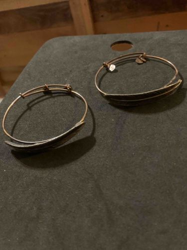 This set contains two matching expandable wire bangles from the brand Alex and Ani, specifically featuring the 'Feather' charm design. Each bracelet is constructed from a non-precious base metal with a 'Rafaelian Silver' or 'Rafaelian Gold' finish, though the lighting and patina suggest a darkened, aged metallic tone consistent with their signature 'vintage' look. The central focal point of each bangle is a curved metal feather charm that serves as a decorative wrap-around element. Structurally, the bracelets utilize a distinct sliding mechanism with two circular metal loops on thin wire, allowing for an adjustable fit. Each bangle is adorned with three small standard brand tags: a circular tag featuring the brand logo, a tag indicating the metal finish (likely stamped 'CO' for recycled copper or 'Infused with Energy'), and another signifying the 'Made in America' manufacturing status. The condition shows moderate signs of use, primarily visible as a dark patina and minor surface tarnish in the crevices of the feather textures and around the sliding loops. This style of jewelry became highly popular in the 2010s, utilizing eco-conscious recycled metals and symbolic charms. The feather motif is commonly associated with spiritual strength and freedom.