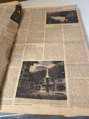 This is a vintage German-language newspaper page or supplement titled 'Das Reiseblatt' (The Travel Journal). The item is printed on broadsheet newsprint paper, which exhibits significant age-related toning, turning a distinct sepia or yellowish-brown hue typical of high-acid paper from the mid-20th century. The layout follows a traditional multi-column format with Fraktur or old-style blackletter typography common in German publishing from the late 19th century through the WWII era. It features two prominent monochrome halftone photographs: a scenic landscape of a lake entitled 'Der Schwarzsee im Berner Oberland' and a larger bottom image depicting a fountain at a resort, captioned 'Sommer im Unter-Engadin'. The text includes articles such as 'An der Quelle des Rheins' and 'Der Rat des Badearztes', indicating a focus on travel, health spas, and nature. Physically, the paper shows minor creasing at the spine where it has been folded, with some edge wear and a slight ripple consistent with long-term storage. There are no immediate signs of large tears or significant foxing, though the uniform discoloration suggests exposure to air and light over several decades. The printing quality is sharp for newsprint, indicating quality period craftsmanship.