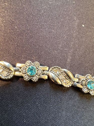 This is a detailed costume jewelry bracelet featuring a repeating pattern of flower and leaf-shaped links. The metal has an antiqued silver-tone finish with darkening in the recesses to highlight the textured detail. Each floral link is composed of a central round, faceted light-blue stone, similar in color to aquamarine, surrounded by six petals. Each petal is textured with a milgrain-like pattern and contains a small, clear inset stone. Alternating with the flowers are elongated oval or leaf-like links that feature a curved, polished metal surface alongside a textured band set with small, clear crystal accents. The links are joined by simple horizontal metal bars, suggesting a flexible bracelet construction. Based on the appearance of the metal and the setting style of the faux gemstones, this is characteristic of mass-produced costume jewelry likely from the late 20th to early 21st century. The condition shows light wear with some minor surface scratching and dust accumulation in the crevices, but no missing stones are immediately visible in this section. There are no obvious maker's marks visible in the provided view, suggesting a commercial brand or unbranded manufacturing.