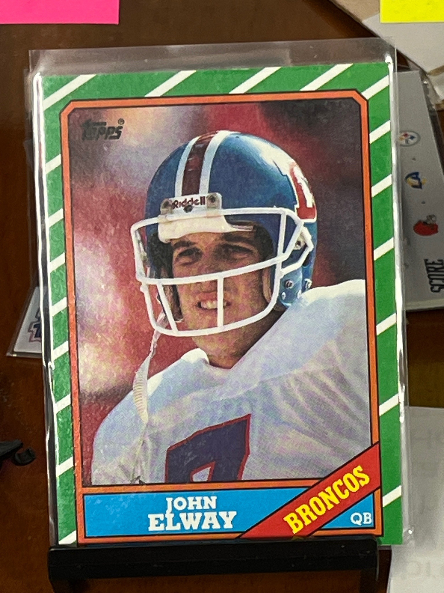 This is a standard 2.5 by 3.5-inch vintage football trading card featuring Hall of Fame quarterback John Elway of the Denver Broncos. Produced by Topps in 1986, the card is characterized by its iconic green border with white diagonal 'yard line' stripes, a design hallmark of the 1986 set. The central image is a tight portrait of Elway in his classic blue Riddell helmet with the orange 'D' logo partially visible. The card's bottom section features Elway's name in bold white serif font over a blue banner, and the team name 'BRONCOS' in yellow block letters set within a red diagonal ribbon. The Topps logo appears in the upper left corner. This specific example appears to be housed in a clear protective plastic sleeve. Observing the physical condition from the image, the centering seems slightly shifted toward the top right edge. The green borders are notoriously difficult to maintain as they show edge wear easily; however, the colors remain vibrant with no significant fading. The surface print quality shows the era's typical dot-matrix texture. No major creases or corner blunting are immediately evident, though a high-resolution microscopic inspection would be required for a definitive grading assessment.