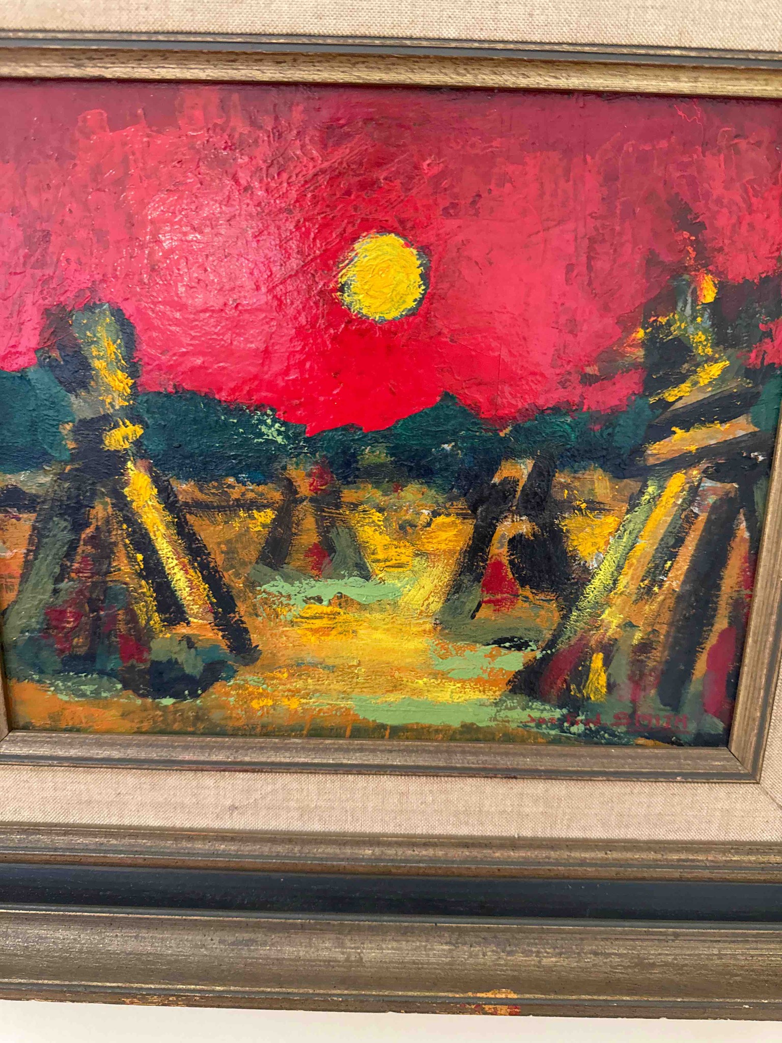 This is an original oil on board or canvas painting, framed in a mid-to-late 20th-century wood frame with a linen-covered liner. The artwork depicts a rural harvest scene featuring multiple haystacks (or stooks) under a dramatic red sky and a bright yellow setting sun. The style is heavily influenced by Expressionism and Fauvism, characterized by bold, saturated colors and thick impasto brushwork that creates a tactile, textured surface. The palette is dominated by intense crimson, cadmium yellow, deep forest green, and earthy ochre. The composition uses high contrast to create a sense of glowing light radiating from the sun. The painting is signed in the lower right corner, likely in red pigment, though the signature requires closer inspection to definitively identify the artist (possibly 'SOUTO' or similar). The framing consists of a dark-toned wood molding with gilded inner edges and a coarse-weave linen mat. The condition appears fair to good; there is visible wear on the frame's finish, including scuffs and losses to the gilding. The painting surface shows original impasto peaks, though minor dust accumulation is present in the crevices. The style and framing suggest a creation date between 1950 and 1970.