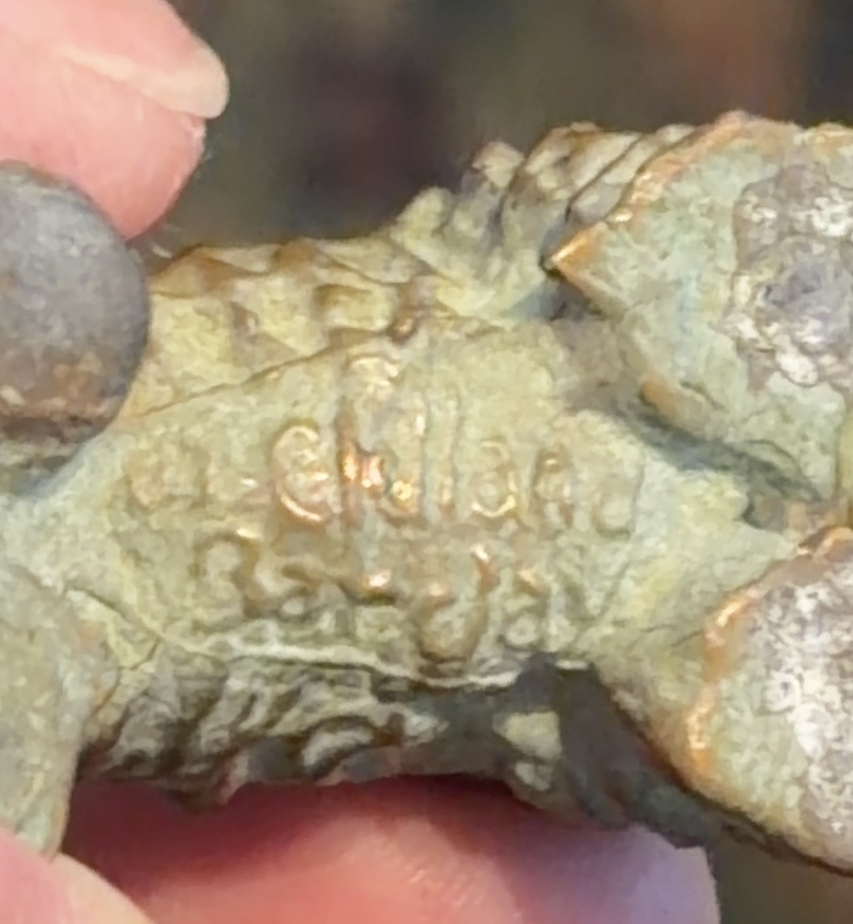 This object is a small-scale sculptural piece cast in a copper-alloy metal, likely bronze or brass, featuring a visible maker's mark or signature. The physical characteristics indicate a cast manufacturing process, evidenced by the textured, somewhat irregular surface that suggests a lost-wax or sand-casting technique. Based on the scale relative to the holding fingers, it is a miniature figure or decorative ornament. The material displays a complex surface patina consisting of heavy oxidation, with shades of pale sage green (verdigris) and grayish-white deposits. This heavy patination covers most of the surface, though high points exhibit a warm, golden-brown metallic luster where the underlying copper alloy has been exposed by handling or intentional polishing. The distinguishing element is the relief-molded signature which appears to read 'Holland' followed by a secondary line, potentially a date or specific series number. The style and script of the lettering suggest a mid-to-late 20th-century origin. Regarding condition, the piece shows significant environmental wear with deep pitting and encrustation in the recessed areas, which may indicate it was exposed to moisture or buried. Despite this, the structural integrity remains solid, and the craftsmanship of the relief lettering indicates a professional foundry origin rather than a hobbyist casting.