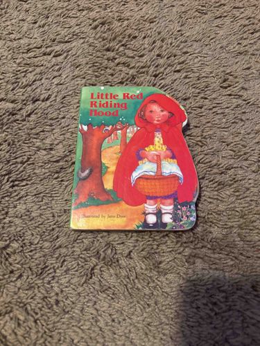 This is a vintage or contemporary children's die-cut board book titled 'Little Red Riding Hood,' featuring illustrations by the renowned artist Jane Dyer. The book is constructed from thick, laminated paperboard, characteristic of 'board books' designed for durability and ease of use by small children. It features a unique die-cut shape on the right edge that follows the contour of the central figure—a young girl wearing a bright red hooded cloak. The cover illustration depicts the title character in a woodland setting, holding a basket and standing near a stylized brown tree trunk. The colors are vibrant, dominated by rich greens, browns, and the signature saturated red of the cloak. The text is printed in a bold red serif font at the top left, with the illustrator's credit, 'Illustrated by Jane Dyer,' clearly visible at the bottom left. In terms of condition, there is visible shelf wear along the edges and corners, particularly at the die-cut protrusions where the laminate shows slight peeling and the cardboard substrate is exposed. There is light scuffing on the surface and minor blunt force indentation near the bottom edge. This specific edition is likely part of a series of classic fairy tales published in the late 20th century, specifically the early 1990s, when Dyer's soft, watercolor-inspired style was frequently used for board book adaptations. The craftsmanship is standard for mass-market juvenile literature, meant for tactile play and early literacy development.