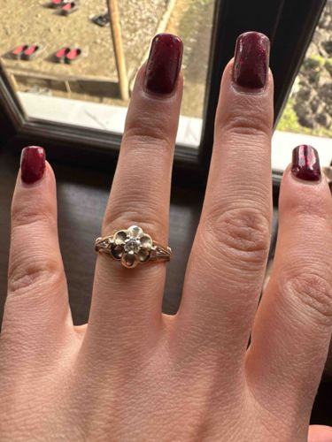 This item is a vintage-style solitaire ring featuring a distinctive floral or quatrefoil-inspired head. The central focal point is a single round brilliant or single-cut colorless gemstone, likely a diamond, secured in a traditional rub-over or bead setting at the center of the petals. The primary material appears to be 10k or 14k yellow gold, exhibiting a warm luster and some minor surface scratches consistent with regular wear. The ring's shoulders are adorned with decorative tapered accents that suggest a mid-20th-century aesthetic, possibly reflecting Retro or late Art Deco influence, estimated to be from the 1940s to 1960s. The head of the ring consists of four rounded, petal-like lobes that create a soft, feminine silhouette. The band or shank is relatively slender, tapering towards the back for comfort. No specific maker's marks or hallmarks are visible in the photograph, but the level of detail in the casting indicates quality commercial craftsmanship from its era. The condition appears sound, with no major deformities visible, though a professional cleaning would likely enhance the brilliance of both the metal and the central stone. This piece is a classic example of sentimental mid-century jewelry, often used as an engagement ring or a 'sweet sixteen' gift.