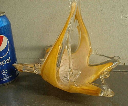 This is a hand-blown art glass decorative basket featuring an organic, fluid shape representative of Mid-Century Modern design. The piece utilizes a sommerso technique, layering a vibrant golden-yellow or amber-colored glass within a thick casing of clear glass. The interior appears to have a textured or 'pulled' white latticino or controlled bubble effect near the base, adding visual depth. The construction is characterized by four distinct pulled points extending horizontally and a central vertical handle formed by two elongated clear glass ribbons fused at the top. Measuring approximately seven to eight inches in height (using the adjacent soda can for scale), the item displays high-quality hand-craftsmanship with smooth, polished edges on the pulled tips. The base appears to be a ground, flat surface typical of authentic hand-blown glass. The condition appears to be excellent with no visible chips or cracks. There are no immediate maker's marks visible in the image, but the style strongly suggests a mid-20th-century origin, likely Italian (Murano) or a high-quality American contemporary like Chalet or Lorraine glass from the 1960s-1970s.