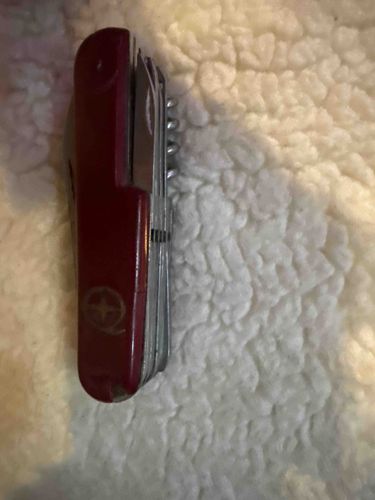 This item is a multi-function folding pocket knife, commonly referred to as a Swiss Army style knife, featuring red cellidor or plastic scales. The tool is composed of multiple stainless steel layers and includes a visible corkscrew on the back, a small blade or awl, and potentially other folding implements like a large blade, drivers, or openers. A distinctive feature is the gold-colored circular emblem on the handle depicting a cross-hair or compass star design, which suggests this may be a non-Victorinox/Wenger imitation or a specific promotional model. Physically, the item shows signs of significant age and heavy use. There is noticeable wear on the red handle scales, including scratches, dulling of the finish, and some chipping near the rivets. The metal components show signs of surface oxidation and debris accumulation between the layers, suggesting it has not been cleaned or oiled recently. The construction utilizes pinned brass or steel rivets to hold the stack of tools and liners together. Given the aesthetic and the specific graphics, this likely dates from the late 20th century (circa 1980s-1990s). The craftsmanship is characteristic of mass-produced utilitarian tools rather than high-end precision cutlery.
