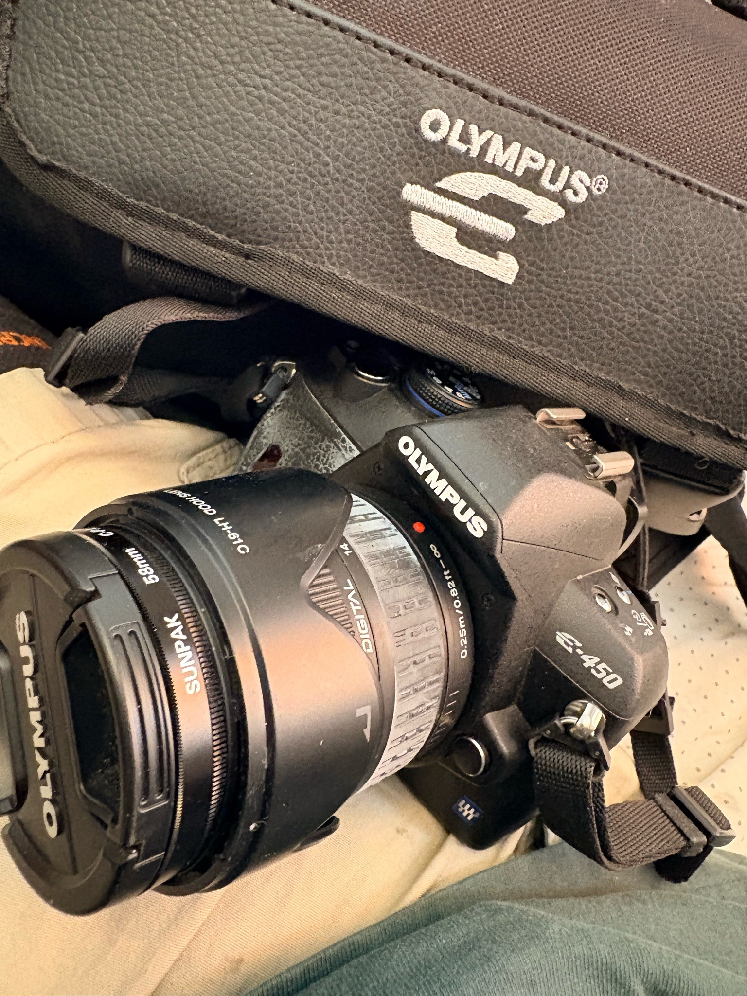 This is a compact Olympus E-450 Digital SLR camera, a model released around 2009 as part of the Four Thirds System. The camera body features a matte black polycarbonate finish with a textured grip. It is equipped with a Zuiko Digital 14-42mm f/3.5-5.6 lens, identifiable by the focal length markings on the barrel. The lens is fitted with an Olympus LH-61C petal-style lens hood, a Sunpak 58mm protective filter, and a standard Olympus snap-on lens cap. The camera is seen resting inside or adjacent to a black Olympus-branded padded camera bag or strap with an embroidered logo. Notable features include the prominent 'E-450' model designation on the front right and the 'Four Thirds' blue and white logo at the bottom corner. Regarding condition, the camera shows significant cosmetic wear. There is heavy salt-like residue or oxidation visible on the lens barrel's rubber zoom ring and on the camera body's flash housing, suggesting exposure to moisture or high humidity. Several scratches are visible on the plastic body, and dust accumulation is present in the crevices around the mode dial and buttons. The strap and carrying case appear in used but functional condition. This kit represents an entry-level consumer DSLR from the late 2000s, noted for its 'ultra-compact' form factor which was a key marketing point for the E-series.