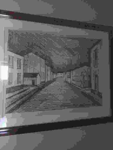 This item is a black and white lithograph print attributed to the renowned French Expressionist artist Bernard Buffet. Typical of Buffet’s mid-20th-century style, the composition features a stark, desolate street scene characterized by his signature 'miserabilist' aesthetic. The work is defined by strong, angular black lines and a heavy use of cross-hatching to create depth and texture in the architectural forms. The perspective draws the eye down a quiet urban corridor flanked by tall, narrow buildings with rectangular windows. The print is executed on paper and is presented in a dark, possibly black or dark wood frame under glass. The color palette is monochromatic, relying on high contrast between the ink and the paper substrate. Notable craftsmanship is visible in the deliberate, scratchy linework that conveys a sense of post-war melancholy. While the specific title isn't visible, Buffet frequently explored vacant Parisian streets and provincial landscapes. The condition appears fair, though the image quality suggests some potential foxing or yellowing of the paper and possible reflections on the glass. There is a visible margin between the print and the frame edge where a signature or edition number would typically be located, though they are obscured in this photograph. This style suggests a production date between the late 1950s and 1970s.
