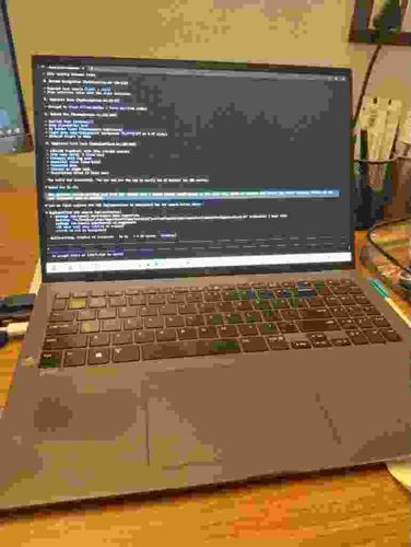 This is a contemporary ultraportable laptop computer featuring a slim-bezel display and a full-sized keyboard with a dedicated numeric keypad. The device is finished in a matte space-gray or charcoal metallic chassis, likely constructed from a magnesium or aluminum alloy to balance weight and durability. The screen is active, displaying a terminal or command-line interface with several lines of programming code or system logs, which suggests high-performance internal specifications suitable for software development or technical engineering. The keyboard features low-profile chiclet-style keys with white lettering and appears to include a multi-touch trackpad positioned slightly to the left of the center. Noteworthy features include a thin top bezel housing an integrated webcam and a robust hinge mechanism. While the specific manufacturer logo is not clearly visible in this perspective, the build quality and design language are consistent with premium business-class laptops from the early 2020s. The physical condition appears excellent with no visible cracks, major scratches, or screen defects, though some minor fingerprint oils are typical for matte finishes. The presence of a USB peripheral plugged into the side indicates active connectivity and use within a professional workstation environment.