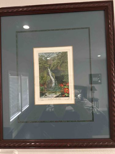 This is a professionally framed landscape print titled 'A Day at the Falls.' The artwork depicts a scenic waterfall cascading into a pool, surrounded by lush green foliage and vibrant red flowers in the foreground. The piece is presented within a sophisticated multi-matting system: an inner light-toned mat with a thin gold-toned fillet or bevel, followed by a large teal-blue outer mat featuring a decorative dark marbleized or floral border inset. The outer frame is a dark mahogany-colored wood with a prominent rope-twist molding design. Text visible at the bottom of the print includes the title and likely a series number or artist signature, indicating it may be a limited edition or specific artist's series from the late 20th century. The condition appears sound with no visible foxing or water damage to the paper, though there are reflections on the glazing indicating standard glass is used. The overall presentation suggests a high-quality decorative framing job intended for traditional or transitional interior design.