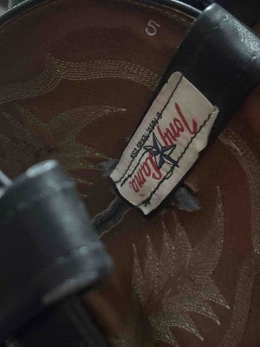 This is a detailed interior view of a pair of vintage Western-style boots manufactured by the renowned El Paso, Texas-based company, Tony Lama. The boots feature a black leather pull strap stitched to the upper, showcasing a classic white woven fabric label with the 'Tony Lama' signature logo in red script, accompanied by a blue star emblem and the 'El Paso, Texas USA' provenance mark. The interior shaft is lined with a tan or light brown leather, which displays intricate, multi-row decorative topstitching in a contrasting light thread, forming a traditional flame or wing motif. A stamped white number '5' is visible near the top rim, likely indicating the size or a factory production code. The leather lining shows signs of age and wear, including surface abrasions, darkening from use, and some fraying at the edges of the pull strap attachment. The overall construction displays high-quality vintage craftsmanship, characteristic of mid-to-late 20th-century American bootmaking. The materials appear to be genuine bovine leather for both the exterior straps and the interior lining, suggesting a durable and professional-grade build.