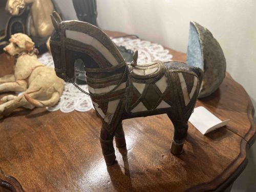This is a decorative hand-crafted horse figurine, likely originating from India, featuring a composite construction of wood, brass, and inlaid bone or shell. The horse is depicted in a standing posture and is heavily ornamented with intricate brass wirework and decorative plates that form a harness and saddle. The body is accented with geometric white inlay panels, likely camel bone or mother-of-pearl, set into a dark wood or resin-coated frame. Notable features include a small brass chain draped around the chest and a raised saddle horn. Measuring approximately 6 to 8 inches in height, the piece exhibits moderate wear consistent with age, including tarnishing of the brass elements, a dull patina on the wood/resin surfaces, and visible adhesive residue or grout between the inlay sections. There appear to be minor chips or misalignments in the white inlay pieces, particularly near the front leg. The overall style is typical of mid-20th-century Indian handicraft, specifically echoing folk art traditions of Rajasthan. The craftsmanship is rustic yet detailed, with the focus on the decorative surface rather than anatomical precision.