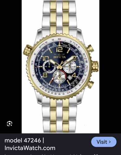 This is a contemporary men's wrist watch from the Invicta Aviator collection, model 47246. The timepiece features a substantial 48-50mm case crafted from stainless steel with a high-polish finish and gold-tone accents. It is equipped with a two-tone stainless steel and gold-tone plated bracelet, displaying a five-link design with a deployment safety clasp. The dial is a deep navy blue, featuring gold-toned Arabic numeral hour markers and luminous sword-shaped hands. A notable design element is the complex slide-rule bezel in a serrated gold-tone finish, used for navigational calculations. The dial hosts three sub-dials: a 60-second timer, a 60-minute counter, and a specialized 24-hour sub-dial at the six o'clock position featuring a decorative anchor motif. A date window is positioned between 4 and 5 o'clock. The watch utilizes a VD54 quartz movement and is protected by a flame fusion crystal. The condition appears to be new-in-box or mint, showing no visible scratches on the crystal, bezel, or bracelet links. The gold plating is uniform with no signs of wear-through or oxidation. This model reflects a modern pilot-style aesthetic with heavy nautical influences, blending functional flight tools with bold, oversized fashion elements characteristic of early 21st-century Invicta designs.