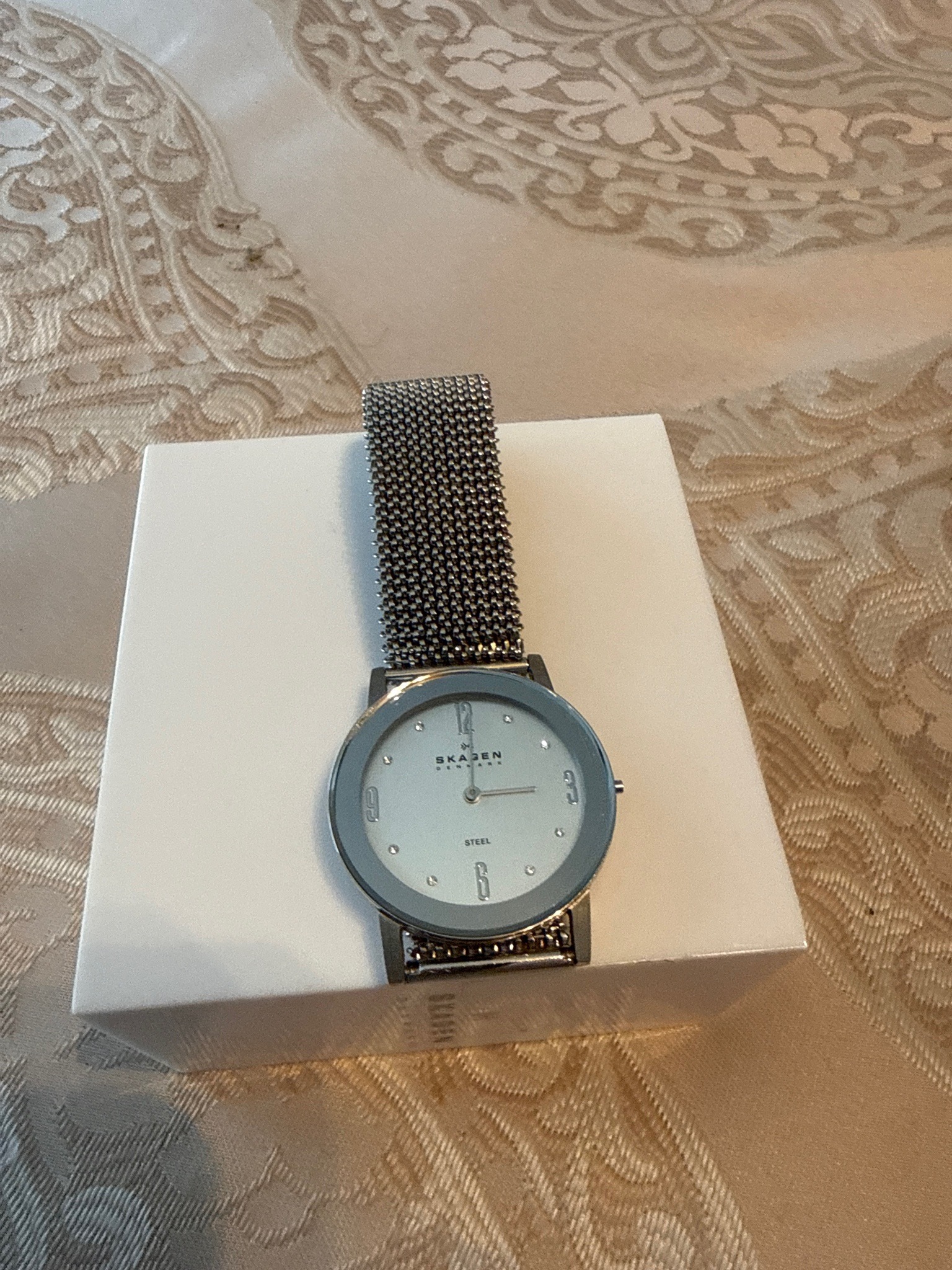 This is a contemporary Skagen Denmark wrist watch featuring a characteristic minimalist Scandinavian design. The watch is constructed from polished stainless steel with a round case and a distinctive silver-tone dial. The dial face is light silver/white with the 'SKAGEN DENMARK' logo below the 12 o'clock position and the word 'STEEL' printed above the 6 o'clock position. It features numerical hour markers for the 12, 3, 6, and 9 positions, while other hours are marked by small, round crystal or polished dot indices. The watch utilizes a three-hand analog quartz movement. A key design element is the integrated stainless steel mesh bracelet, often referred to as a Milanese loop, which provides a flexible and smooth texture against the skin. The watch case has a relatively slim profile, which is a hallmark of the Skagen brand. Based on its style and the presence of the original white presentation box, the item appears to be from the early 21st century (circa 2010-2020). The condition appears excellent with no visible scratches on the crystal or significant tarnishing on the mesh band, though the functional state of the battery cannot be determined from the image. The craftsmanship reflects Skagen's mid-market positioning, focusing on sleek aesthetics and durable steel construction.