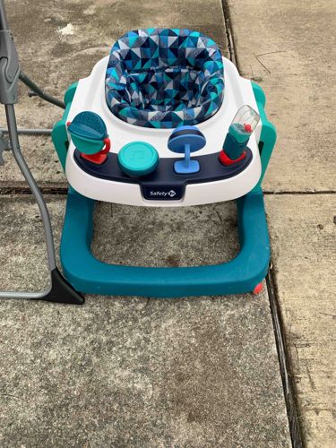 This is a Safety 1st brand baby walker, designed for infants who are beginning to sit up and find their footing. The item features a robust white molded plastic upper frame resting on a teal or dark turquoise wide-base plastic chassis, which provides stability and houses recessed wheels for movement. The seat is comprised of a padded fabric insert with a geometric triangular pattern in various shades of blue, navy, and grey. Centered on the front of the white tray is a navy blue activity station equipped with several developmental toys: a textured red and teal spinning toy, a large teal musical button, a blue mirror-like wand, and a clear rattle containing small red beads. The 'Safety 1st' brand logo is clearly visible on a black sticker at the center front. In terms of condition, the walker appears to be in used but functional state. There is visible surface grime and scuffing along the teal base, likely from contact with flooring or outdoor storage as it is pictured on a concrete sidewalk. The fabric seat appears intact without visible tears, though minor pilling and fading from washing are typical for this age. The plastic surfaces show some dulling and superficial scratches consistent with household use. All integrated toys appear present and unbroken, making it a standard examples of contemporary mass-produced nursery gear from the late 2010s to early 2020s.