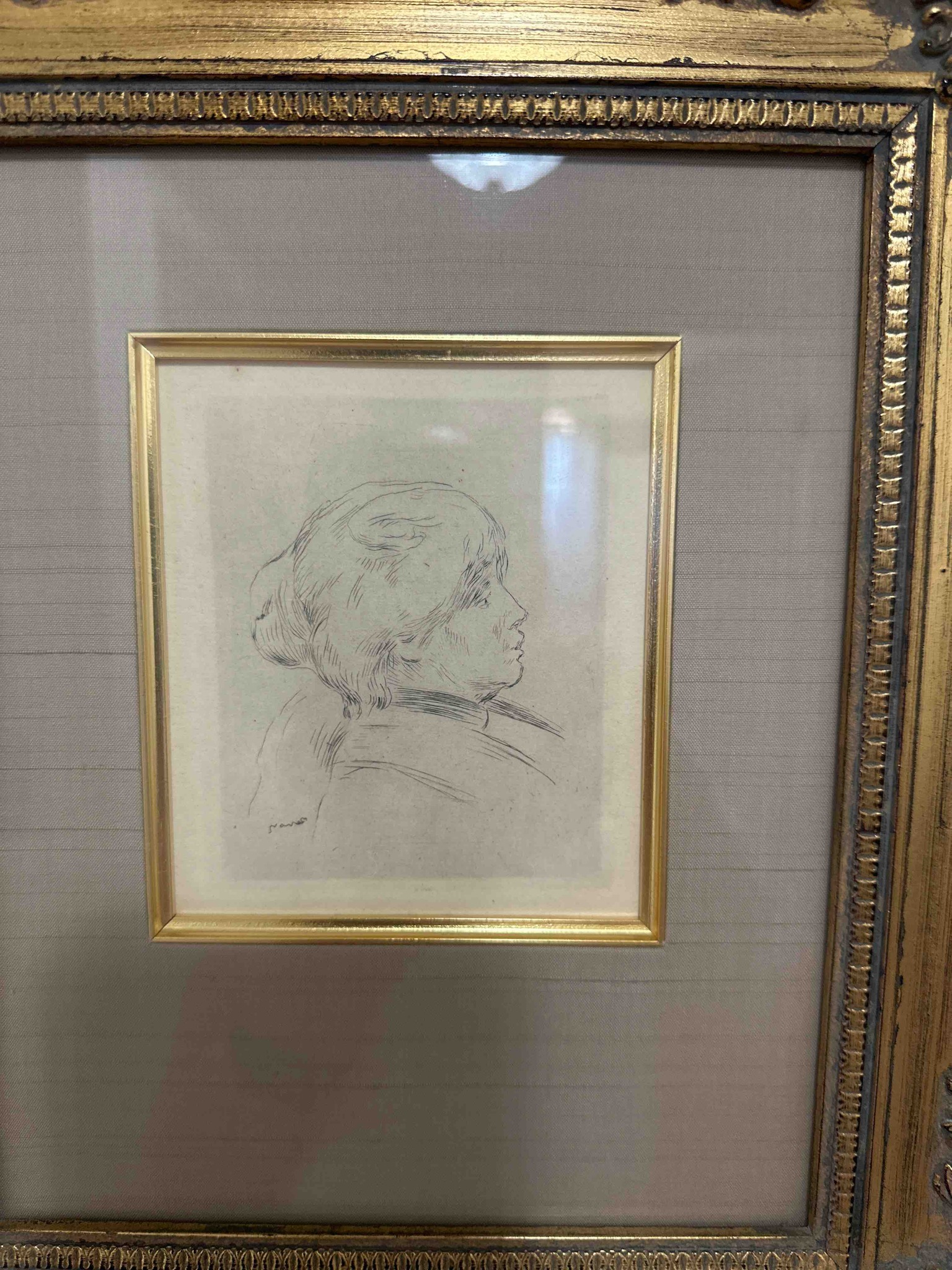 This item is an original etching on paper, identified as 'Claude Renoir, la Tête Baissée' (Claude Renoir, Head Lowered) by the renowned French Impressionist artist Pierre-Auguste Renoir, circa 1904. The artwork depicts a profile portrait of the artist's son, Claude, executed with delicate, flowing lines characteristic of Renoir's late graphic style. The etching is printed in black ink on off-white or cream-toned paper. A visible stamped or plate-signed signature 'Renoir' is located in the lower-left corner of the image area. The paper exhibits a slight even toning consistent with age, but no major foxing or tears are immediately visible from the front. The piece is housed in an elaborate, high-quality presentation including a gold-leafed inner fillet, a wide silk-wrapped mat in a muted grey-taupe hue, and a substantial secondary gilded wood frame. The outer frame features ornate neoclassical beaded and cove moldings with visible distressing and a rich gold-leaf patina. The craftsmanship of the framing suggests a mid-to-late 20th-century professional gallery mounting, designed to protect and elevate the delicate paper work. The overall condition appears excellent for a work of this period, retaining sharp line definition and clean margins within the matting.