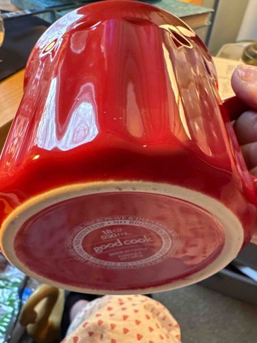 This item is a large-format ceramic mug, finished in a vibrant, high-gloss cherry red glaze. The vessel is designed with a flared or convex profile, tapering slightly toward the unglazed base ring. It has a significant capacity of 18 ounces (530 mL), positioning it as a soup mug or oversized coffee cup. The exterior features vertical fluting or a paneled texture that adds aesthetic interest and a better grip surface. On the underside, the manufacturer's mark 'good cook' is clearly stamped along with technical specifications indicating it is dishwasher, microwave, and oven safe up to 450 degrees Fahrenheit, but not for stovetop or broiler use. The bottom also confirms it was 'Made in China.' Mechanically, the construction appears to be high-fired stoneware or earthenware, providing durability for kitchen tasks. The condition appears to be excellent with no visible cracks, chips, or crazing in the glaze, suggesting it is a contemporary piece of mass-produced functional kitchenware. The glaze exhibits a smooth, reflective finish with minimal signs of utensil wear or use-related abrasion. It represents a practical, modern style of culinary utility found in mid-tier retail markets.