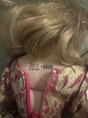 This item is a collectible porcelain fashion doll, specifically identified by the hand-numbered limited edition markings on the back of its neck. The doll features a bisque porcelain head with a smooth, matte finish, adorned with synthetic blonde rooted hair styled in soft waves. A critical distinguishing element is the black ink stamp and hand-written sequence number '3411/5500 - 5500' located at the nape of the neck, indicating it is unit 3,411 out of a total production run of 5,500. Below the ink markings, faint embossed numbers, possibly '64', suggest a particular mold or series designation. The doll wears an elaborate metallic brocade dress in shades of vibrant pink and gold, secured with a visible pink zipper. The construction shows high-quality craftsmanship typical of the late 20th-century doll boom (roughly 1980s-1990s). The piece appears to be in good vintage condition, though the hair is slightly tangled and the porcelain shows minor surface dirt. Such pieces were often produced by companies like The Ashton-Drake Galleries or Franklin Mint for adult collectors rather than for play.