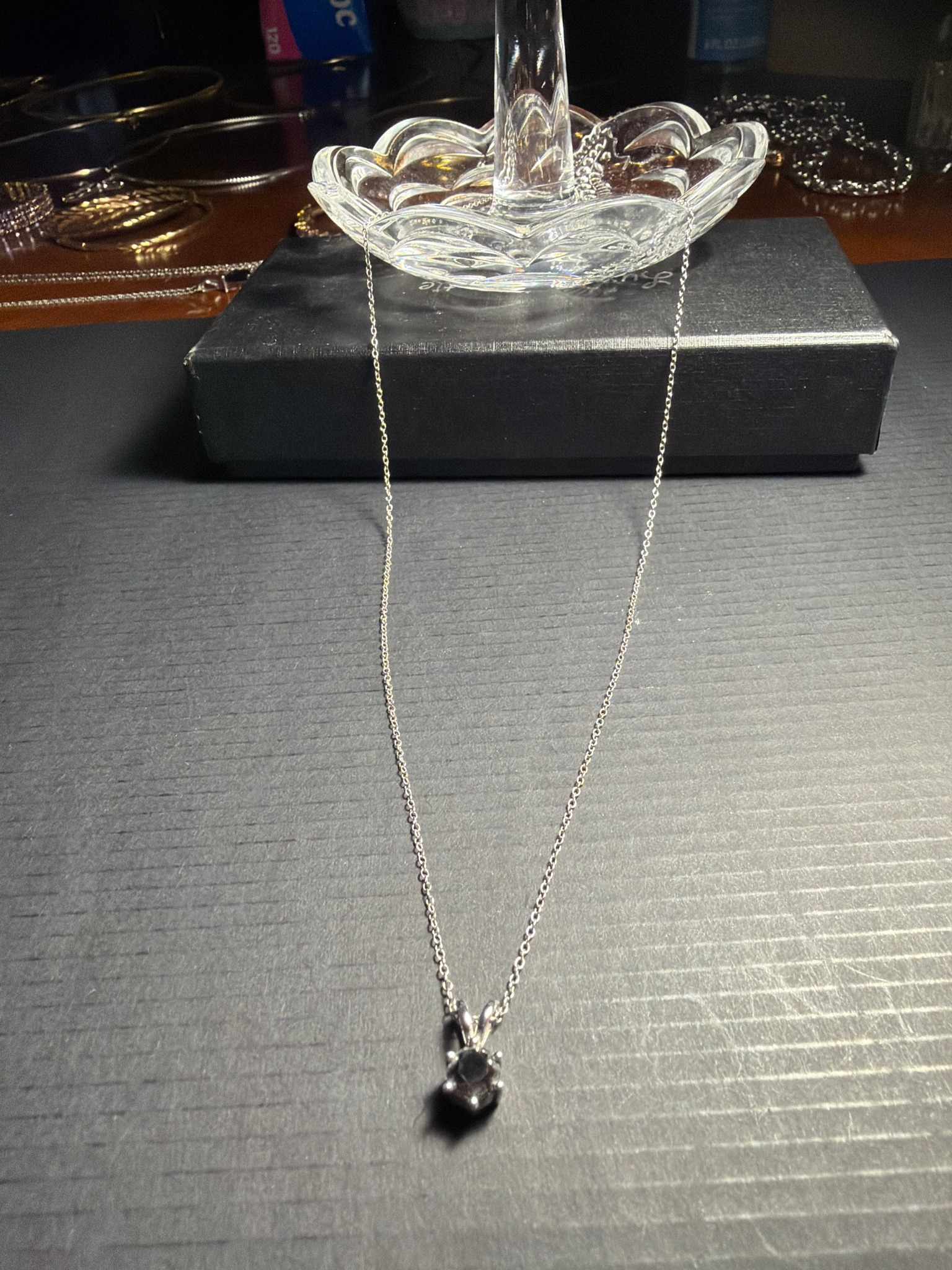 This jewelry piece consists of a dark-toned gemstone solitaire pendant suspended from a fine metallic cable chain. The pendant features a single round-cut or oval-cut stone, appearing dark brown, black, or deep garnet in color, secured within a multi-pronged basket setting. The setting is mounted to a tapered V-shaped bail that allows the pendant to slide freely along the chain. The chain itself is a thin, bright white-metal cable link, likely sterling silver or white gold, characterized by its mirrored high-polish finish. The overall necklace length appears to be approximately 16 to 18 inches. The metallic surfaces show minor surface scratches consistent with light wear, but no significant deformation or structural damage is visible. The stone appears securely set, though the exact facet clarity is difficult to determine under the current lighting. The simple, elegant design is characteristic of contemporary fine jewelry or higher-end fashion jewelry from the late 20th to early 21st century. No maker's marks or metal purity hallmarks are visible in the photograph, but the high-quality craftsmanship of the prongs suggests professional manufacturing. The necklace is presented alongside a pressed glass ring holder and a black rectangular jewelry box, implying a careful manner of storage.
