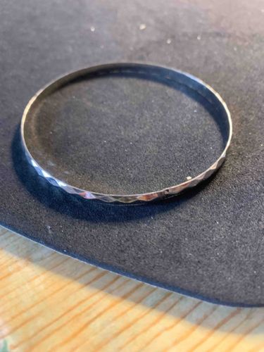 This item is a circular, rigid bangle bracelet featuring a classic continuous loop design. It is constructed from a silver-toned metal, likely sterling silver or silver-plated brass, characterized by a bright, reflective finish. The exterior surface is embellished with a 'diamond-cut' or faceted geometric pattern, consisting of interlocking triangular or lozenge shapes that catch and refract the light, creating a sparkling effect similar to pavé stones. This texture provides a high level of visual depth to a relatively thin band. The interior of the bangle appears smooth and polished for comfort against the skin. In terms of dimensions, it appears to be a standard size, approximately 2.5 to 3 inches in diameter with a width of roughly 3-5mm. Examining the condition, the piece shows minor surface scratches and faint evidence of oxidation or tarnish in the deeper grooves of the pattern, typical for a vintage or pre-owned item. There are no visible maker's marks or fineness stamps in this view, though they may be located on the interior rim. The style is mid-to-late 20th century, specifically the 1980s or 1990s, when diamond-cut patterns were highly popular in costume and fine jewelry. The craftsmanship is consistent with mass-produced but quality-finished jewelry, showing uniform repetition of the decorative motif and a seamless exterior join.