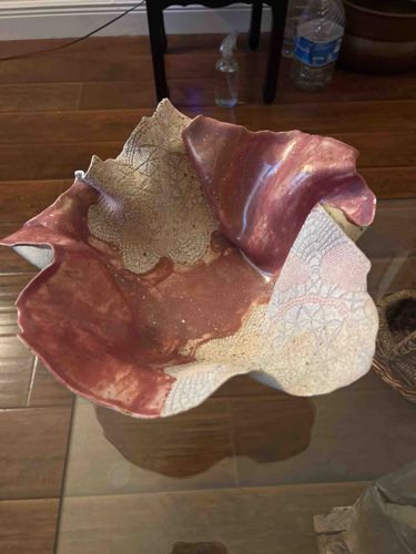This is a hand-built contemporary ceramic decorative bowl featuring a free-form, organic handkerchief silhouette with highly irregular, undulating edges. The vessel is constructed using a slab-built method where the clay has been draped or manipulated to create deep folds and a sense of movement. The interior treatment is a complex combination of glazing and texture; it features segments of a rich matte mauve or dusty rose glaze contrasted with cream-colored sections that have been impressed with a fine, lace-like doile pattern, creating a delicate relief. There are visible red-toned washes or glazes in the basin of the bowl that suggest a layered application technique. The exterior appears to be a neutral, light-colored stoneware or porcelain body. The piece demonstrates a high level of artisanal craftsmanship, emphasizing the tactile nature of the material. Condition appears excellent with no visible cracks or significant chips, though the intentional irregularity of the rim makes it difficult to distinguish post-production wear from original design. This art pottery piece likely dates from the late 20th to early 21st century and exemplifies the studio pottery movement's focus on organic forms and mixed textures.